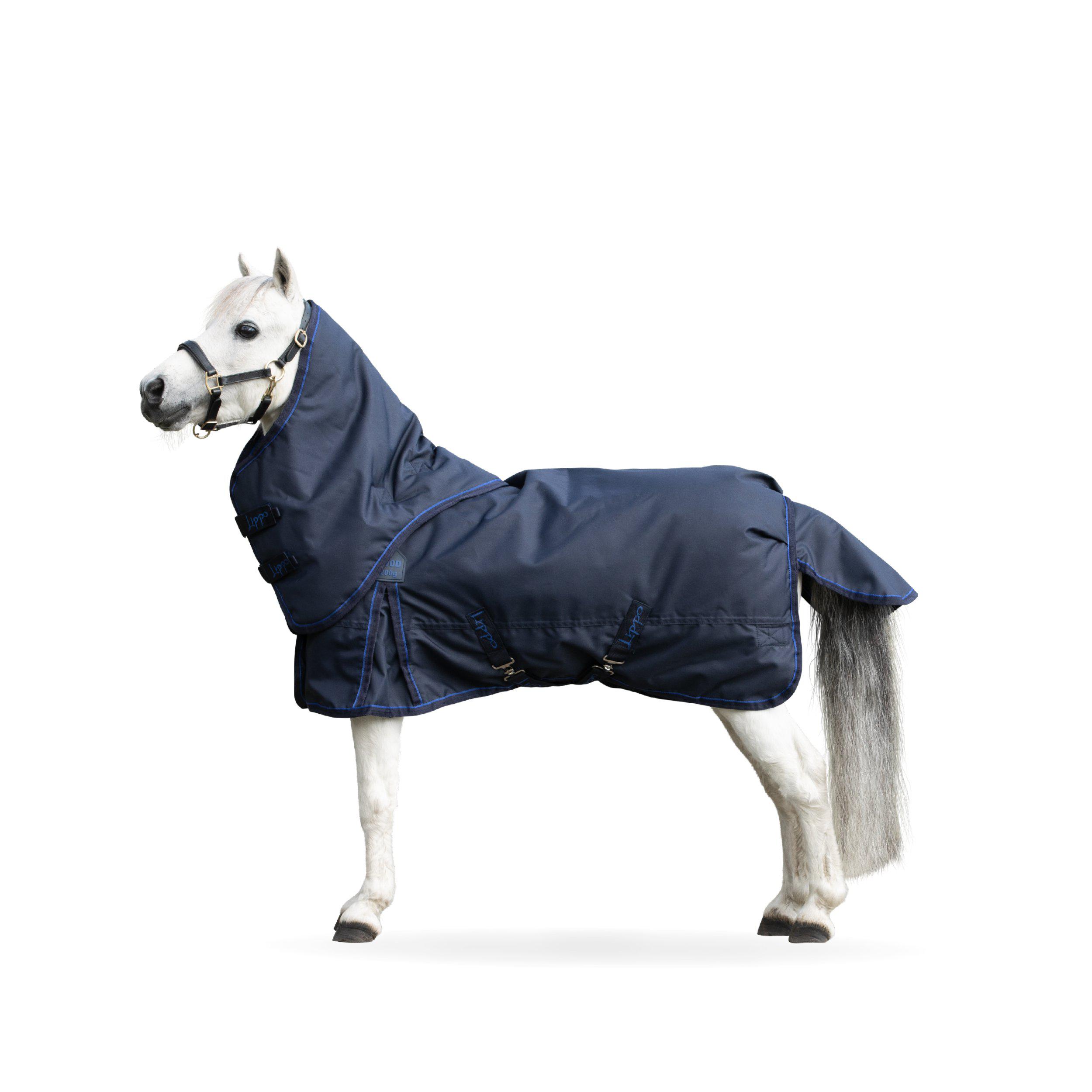 Lätt och smidigt kvalitetstäcke i 600D med god passform, utvecklat för amerikanska miniatyrhästar. 3000MVT andasfunktion och 3000WP vattentäthet. Enkelt bogspänne med kardborre och dubbla halsspännen med elastik. Kryssgjordar, bogveck, svansskydd, avtagbar svansrem och fäste för bensnören. Levereras med avtagbart halstäcke. Nylonfoder med polyesterfyllning.