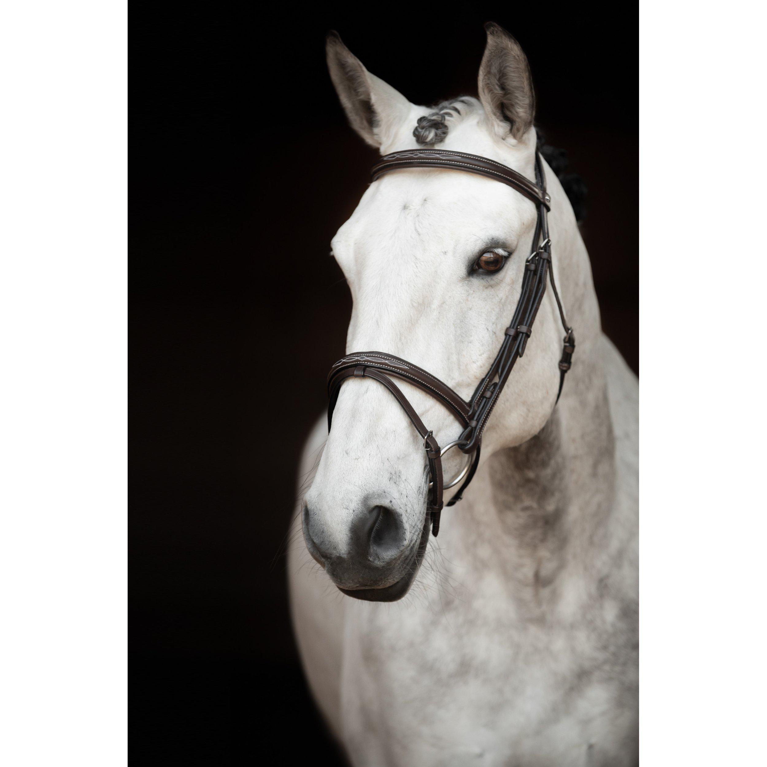 Aachenträns med kombinerad nosgrimma tillverkat i mjukt smidigt läder. Mjukt fodrad nosgrimma och pannband. Nätt fodrat nackstycke. Komplett med supergrip tygel, bredd 16 mm. Rakt pannband med ljusa sömmar. Rostfria söljor.
