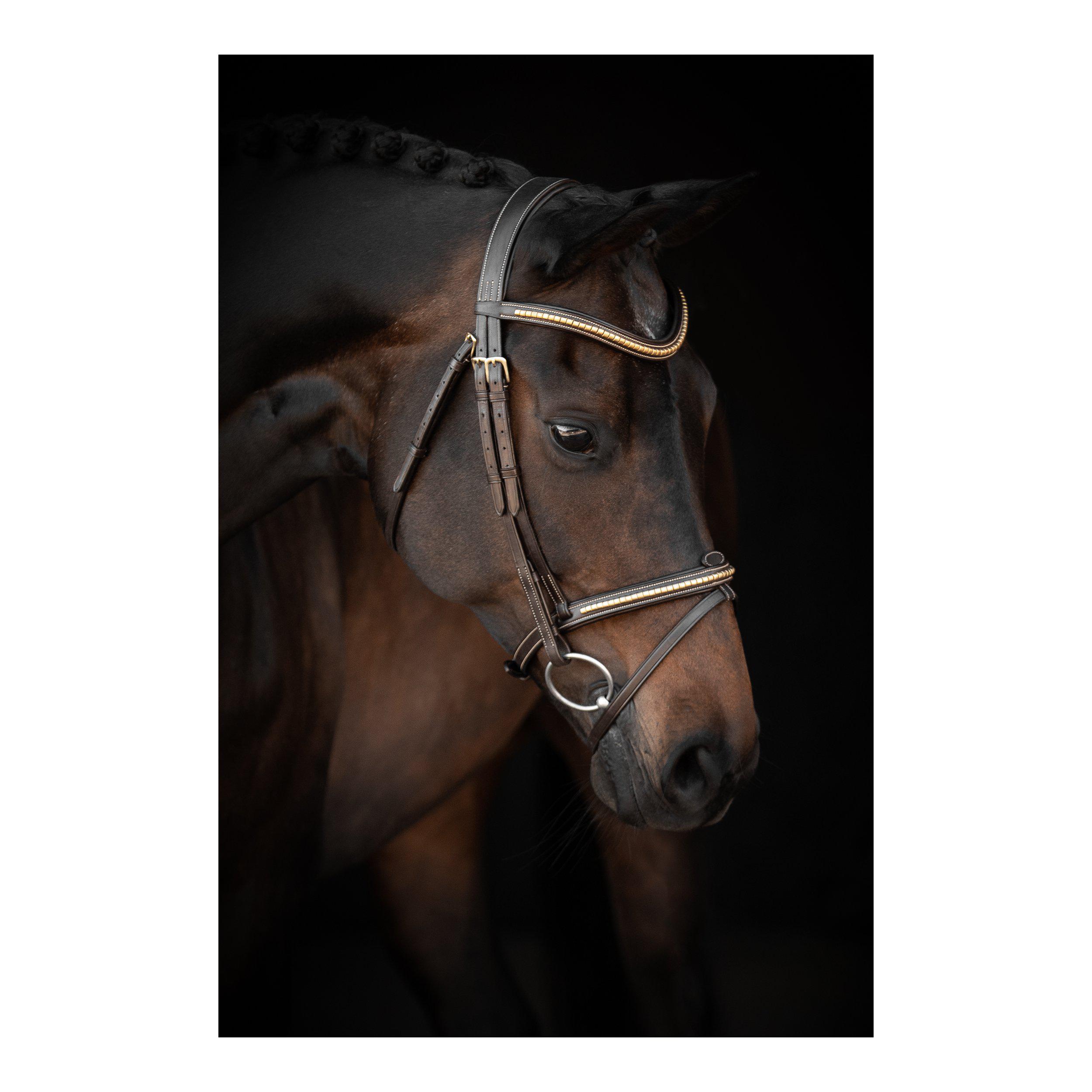 Aachenträns med kombinerad nosgrimma i mjukt amerikanskt kvalitetsläder. Anatomiskt format nackstycke. Dekorerat med klinker på svängt pannband och nosgrimma som är mjukt fodrade. Klinker i äkta mässing.